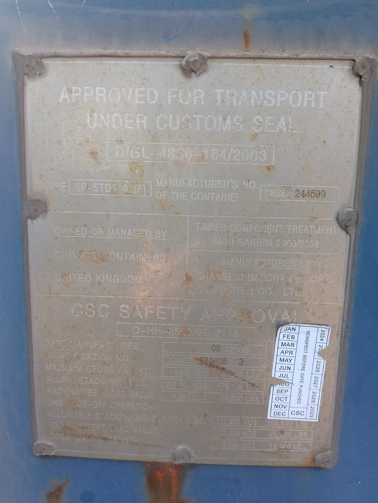 • с действующей табличкой КБК (соответствуют международной Конвенции по безопасности контейнеров=CSC plate valid) — минимум 12 месяцев;